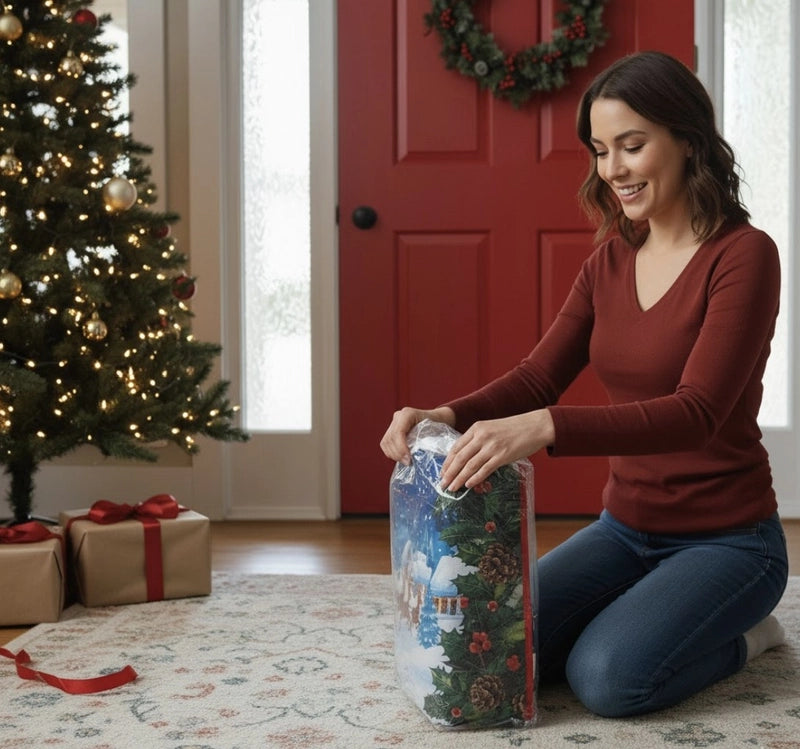 Limpiar es muy sencillo con un paño húmedo. Para almacenar, simplemente dóblala y guárdala en un lugar seco. Su diseño compacto facilita el almacenamiento hasta la próxima Navidad, lista para reutilizar.